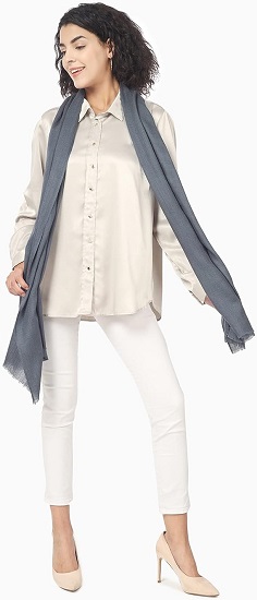 • The traditional way to wear it is as a “wrap around” placed around your neck, allowing both ends to hang freely. It looks great as a pashmina, swift scarf and even belted.