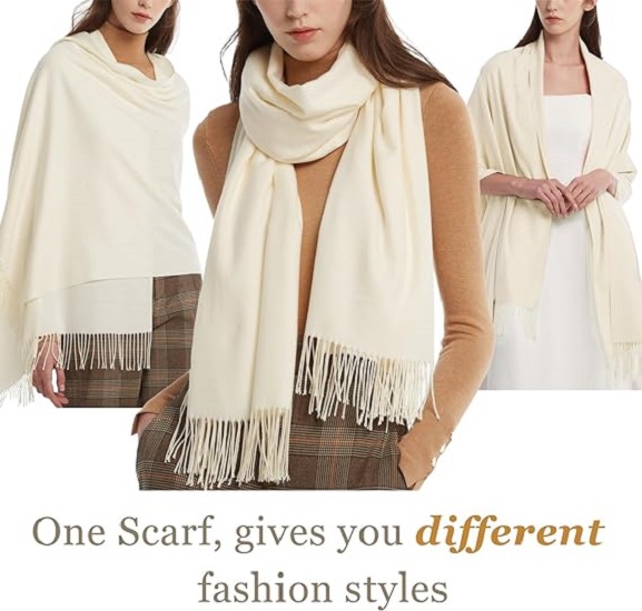 • Cashmere Feel Scarf Shawl: Blend of fine viscose and modal. It's soft, medium weight, and has a subtle sheen. Drapes nicely and stays wrinkle free.