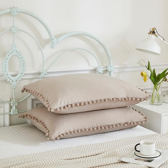 SOFT WASHED MICROFIBER- 100% Soft Washed Microfiber, lightweight, fade-resistant. Washed Microfiber pillowcases is really really SOFT!!! It has cute pom poms, really match your bedroom.